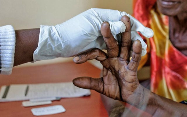 An elderly woman gets tested for malaria at FIMRC Health Center III in Bududa district, eastern Uganda, on April 7, 2017. (Esther MABABZI / AFP)