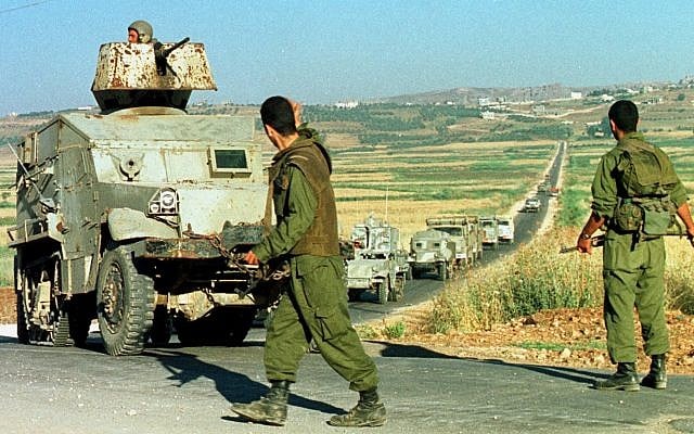 Two militiamen of the Israeli-backed South Lebanon Army direct a convoy of armored vehicles in southern Lebanon, June 3, 1999. (Butros Wanna/AP)