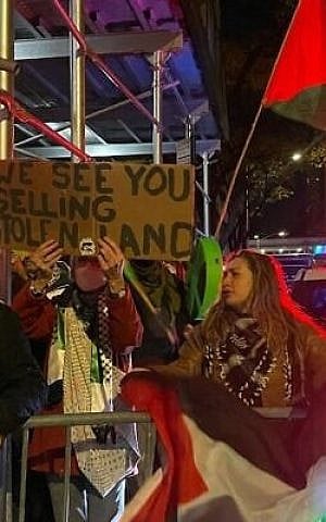 Protesters at Park East Synagogue in New York City, November 19, 2025. (Luke Tress/Times of Israel)