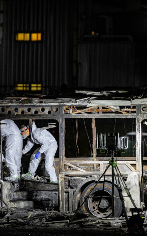 Israeli security forces at the scene of a bus bombing in Bat Yam, central Israel, February 20, 2025. (Chaim Goldberg/Flash90)