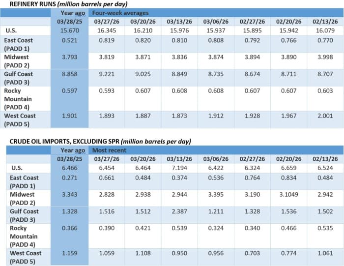 Venezuela’s Crude Exports Continue Rising. Venezuela’s oil exports jumped past the 1 million b/day mark in March for the first time since September 2025, boosted by increasing flows to Caribbean islands (used for blending by traders) and a surging demand for heavy barrels from India’s private refiners.