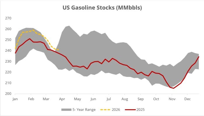 Russia Bans Gasoline Exports until July. Russia’s government has imposed a ban on gasoline exports for refiners until the end of July, citing the need to keep domestic prices steady ahead of high-demand season in the summer, taking some 120,000 b/d of gasoline flows off the global markets.