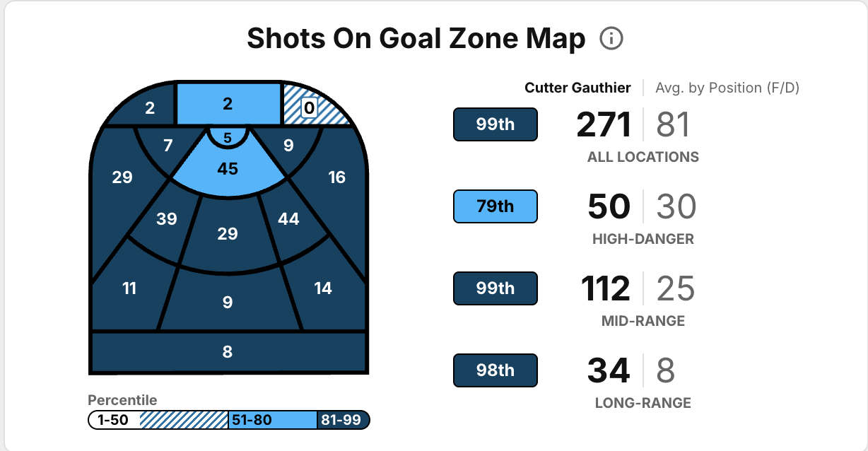 10. The laser disguised as 22-year-old Cutter Gauthier’s shot is in the 99th percentile for both the NHL’s hardest (99.9 m.p.h.) and most frequent (271) this season.