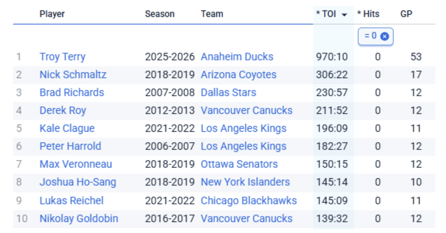 Since time on ice (2000-01) and hits (2005-06) have been tracked, Terry is the first player to reach 310 minutes without a hit. Now he’s closing in on 1,000.