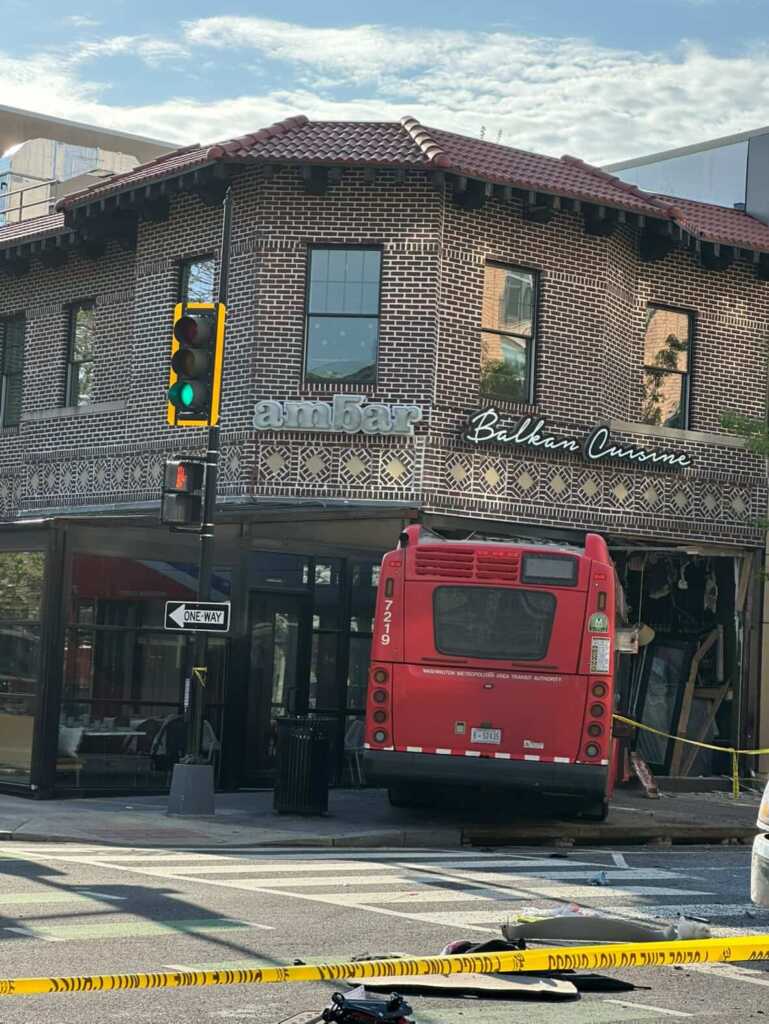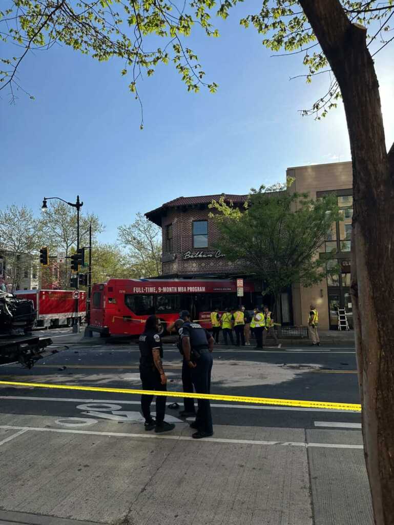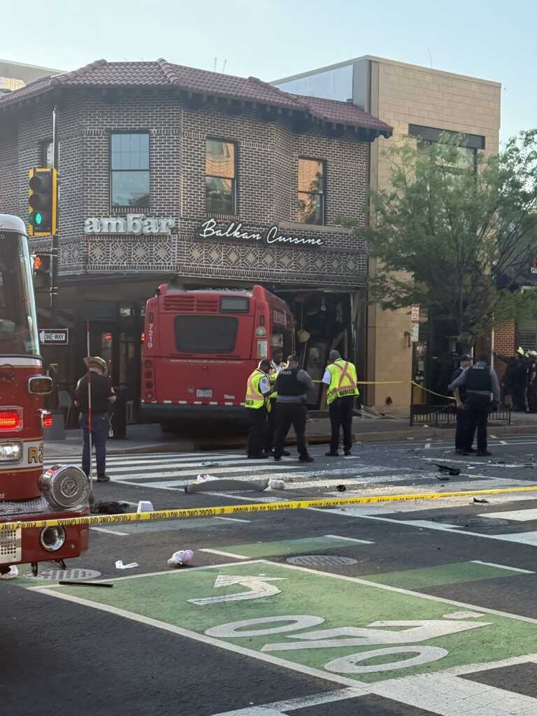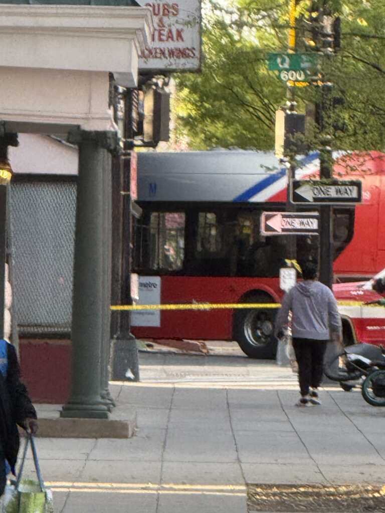 “Update vehicle into structure 7th & Q Sts NW. Bus has been removed from the building. No major structural integrity issues. No shoring required by @dcfireems. Units will be clearing the scene.”