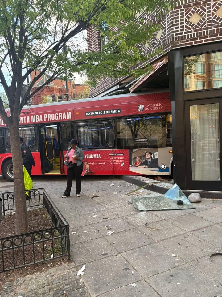 “Update vehicle into building 7th & Q Sts NW. 3 adult female patients transported with minor injuries. Further structural assessment will be conducted once bus has been removed from inside building.