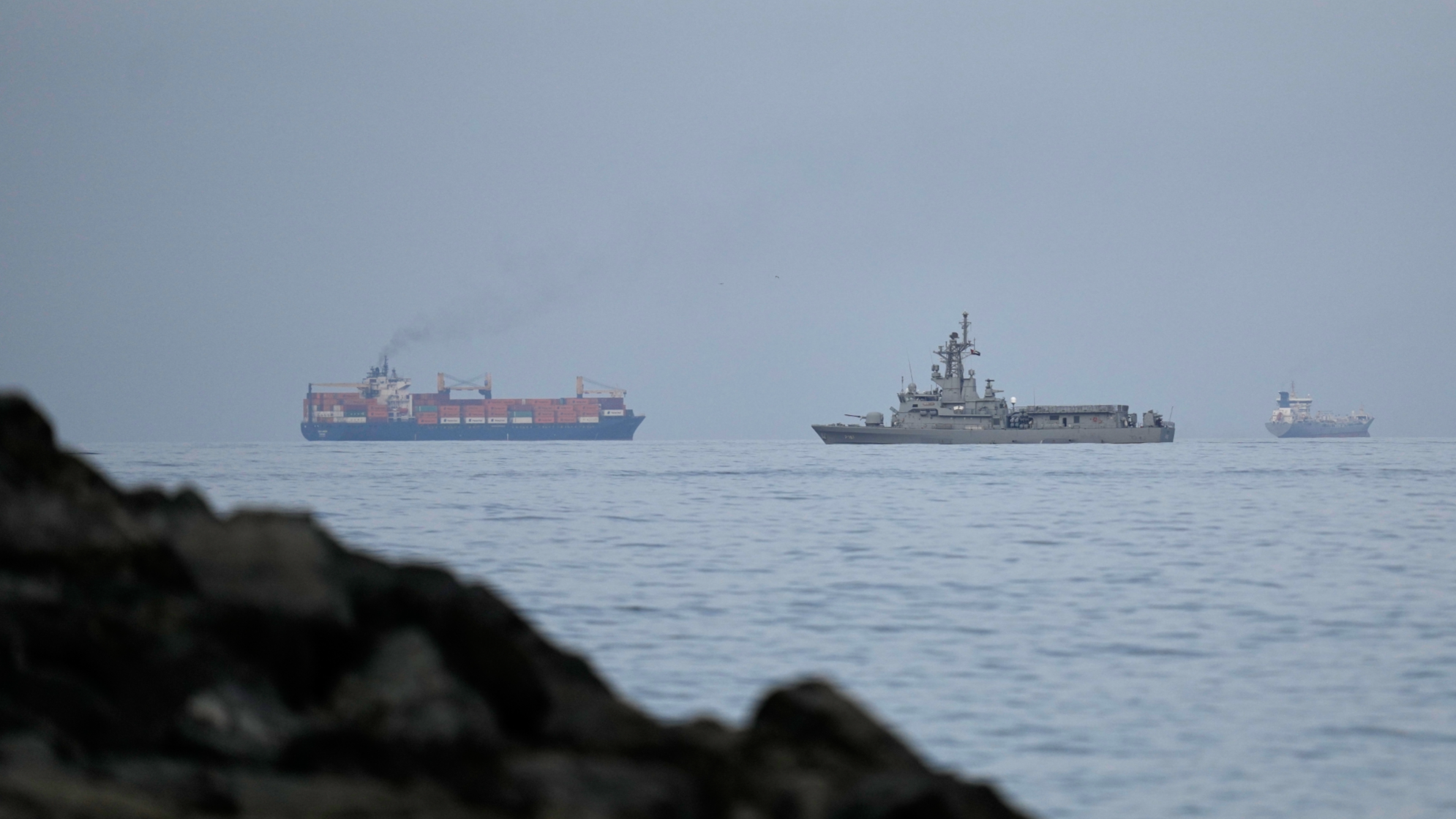 A UAE navy ship sails next to a cargo ship in the Strait of Hormuz as seen from Khor Fakkan, United Arab Emirates, March 11, 2026. (PHOTO/AP)