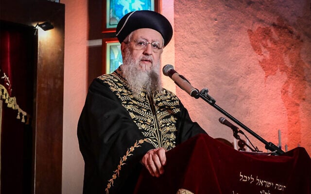 Sephardi Chief Rabbi David Yosef at a menorah-lighting ceremony on the sixth night of the Jewish holiday of Hanukkah, at the Great Synagogue in Tel Aviv, December 30, 2024. (Avshalom Sassoni/Flash90)