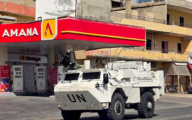 A vehicle of the United Nations Interim Force in Lebanon (UNIFIL) moves along a street in Lebanon’s southern coastal city of Tyre on March 18, 2026. (Kawnat HAJU / AFP)