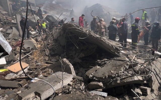Rescue workers search for victims at the site of an Israeli airstrike that hit a crowded neighborhood south of Beirut, Lebanon, April 5, 2026. (AP Photo/Hussein Malla)