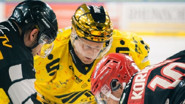 The 28-year-old plays centre for the Krefeld Pinguine of the Deutsche Eishockey Liga 2 (DEL2) where each team’s leading scorer wears a golden helmet during games. Think a Tour de France yellow jersey except with skates and bodychecking instead of bikes and Alps.Â