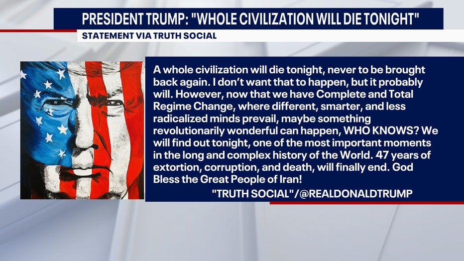 8:10 a.m. ET: President Trump takes to social media with a new threat to Iran, saying “A whole civilization will die tonight, never to be brought back again” if his deadline is not met.