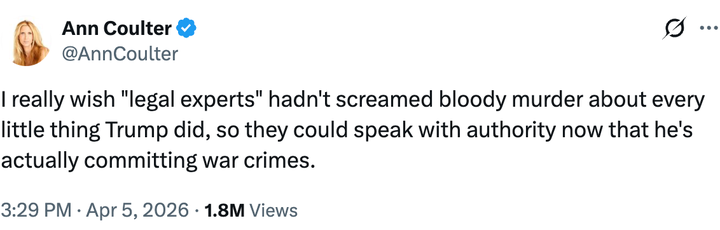 Over the past week, Coulter also reshared several posts calling out Trump and his administration over the war, including one from a user who took issue with the president’s “open the fuckin’ strait” threat.
