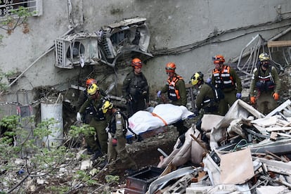 Israeli rescue teams carry a covered body while searching the site where a residential building was hit by an Iranian missile attack in Haifa on April 6, 2026.JAMAL AWAD (EFE)