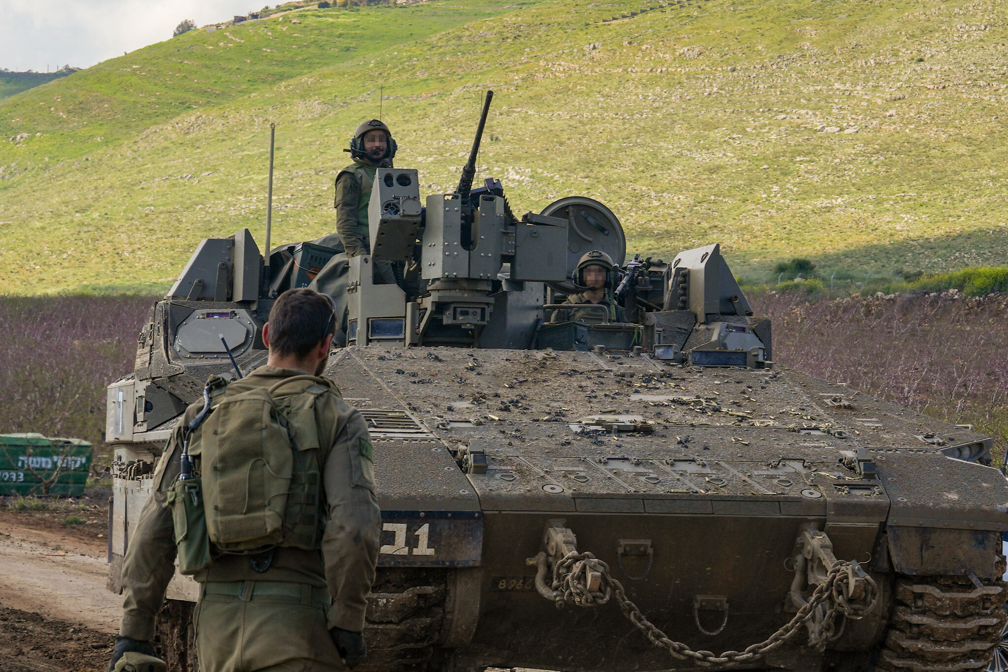 Israeli military vehicles are seen along the Israeli border with Lebanon amid the ongoing war, April 8, 2026. (Ayal Margolin/Flash90)