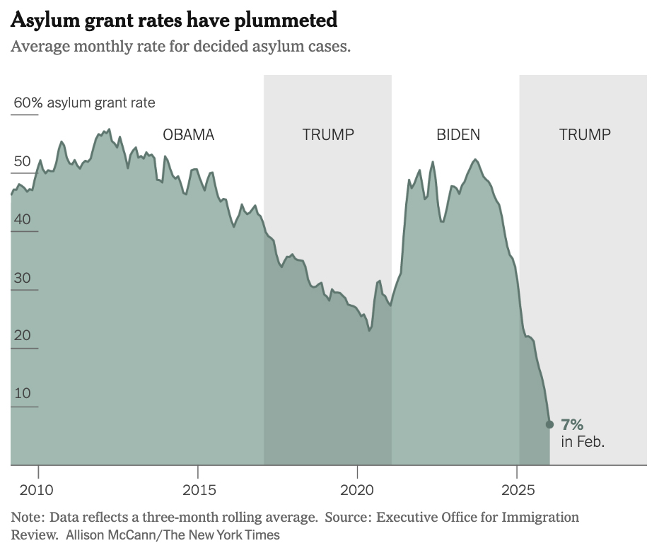 Asylum grant rates have collapsed: Under President Trump, asylum is now granted in just 7% of cases — a historic low, plummeting from over 50% rubber-stamped under Biden.