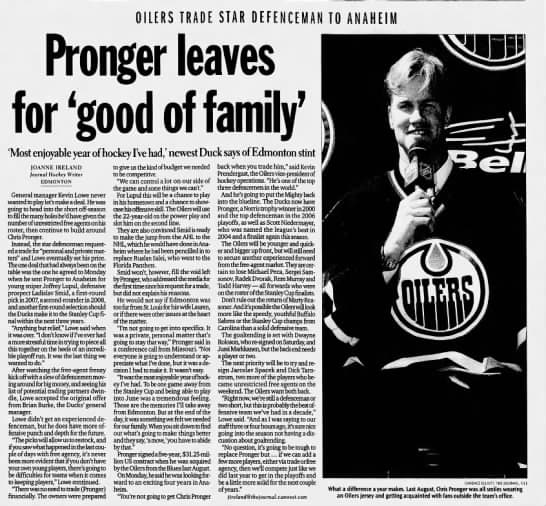 After being eliminated by the Oilers in the Western Conference Final the previous year, Pronger helped lead the Ducks to the Stanley Cup that season. He said at the time that he enjoyed Edmonton, but needed to do what was right for his family.