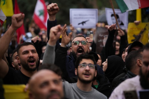 Hezbollah supporters shout slogans during a protest against the Lebanese Prime Minister Nawaf Salam, in front the government palace in Beirut, Lebanon, April 10, 2026. © Emilio Morenatti, AP