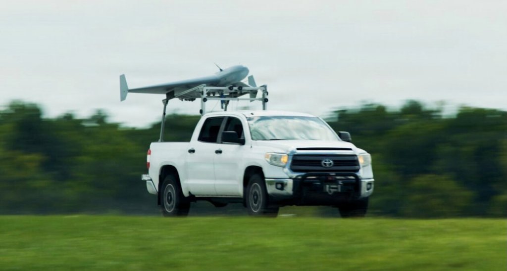 A LUCAS drone being launched by a Toyota pickup. (Indiana National Guard)