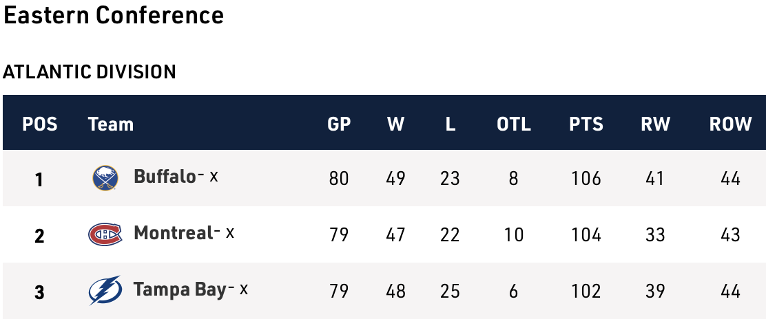 Tampa Bay: The Lightning’s tiebreaker scenario against Buffalo is interesting. They could still pass the Sabres in regulation wins, but if they fail to put another RW on the board in Saturday’s matinee in Boston, they would then only be able to tie the Sabres there. The second and third tiebreakers (ROW, total wins) are also still up in the air. But there exists the possibility that a Sabres-Lightning standings tie would require a fourth tiebreaker — the head-to-head result — which the Sabres have already clinched. A loss against the Bruins would put the Lightning in a tough spot in its last two games next week against Detroit and the Rangers.