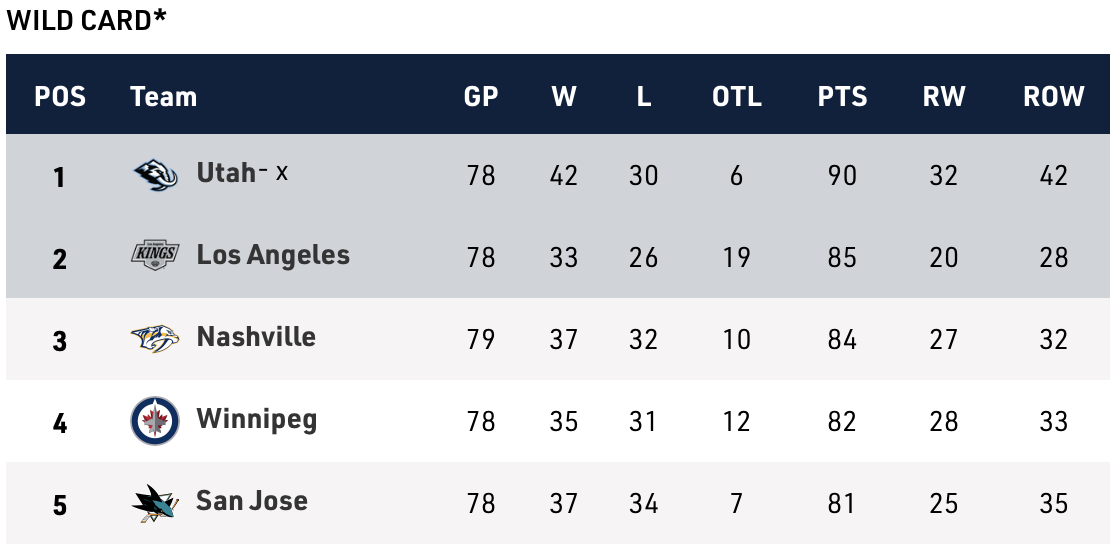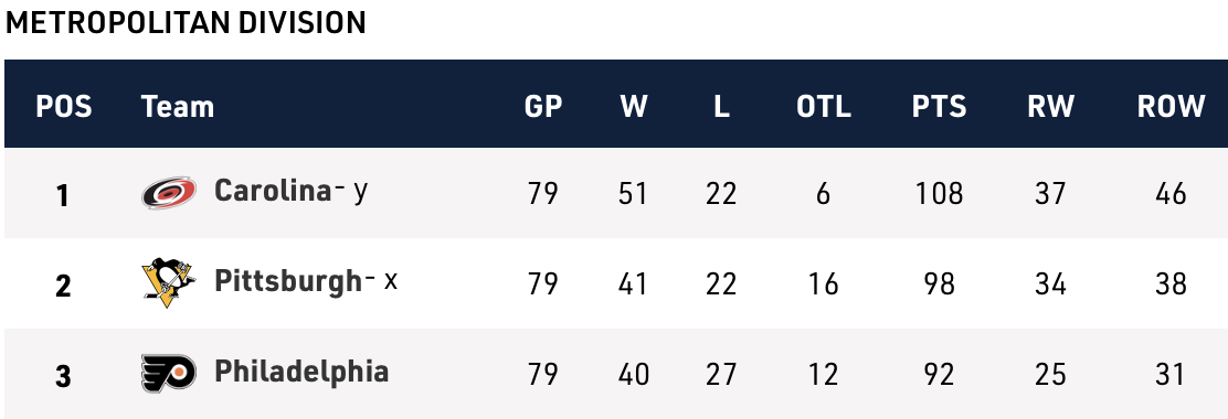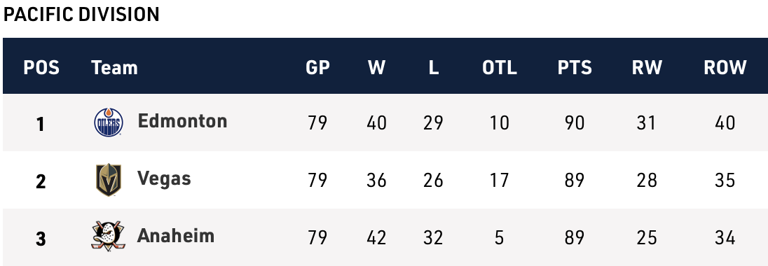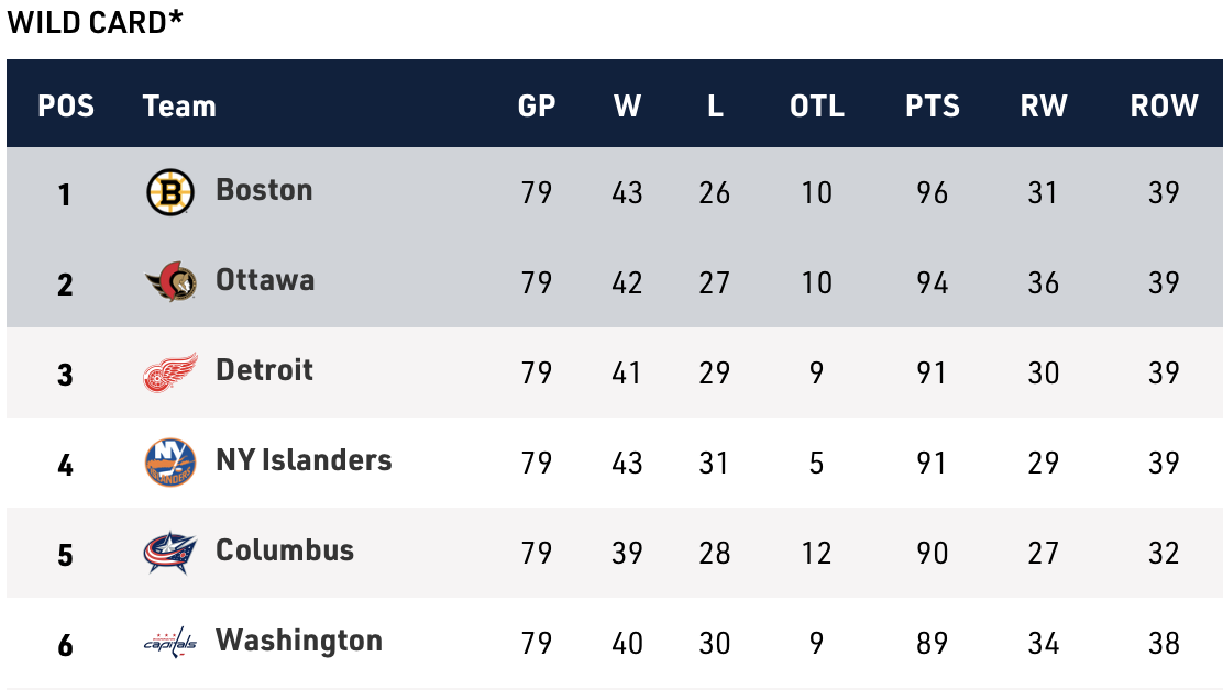 At this point in the schedule it’s most important to keep in mind the tiebreakers. The first column you should be concerned with is regulation wins (RW) as that will be the first tiebreaker used. If teams are tied in RW, the next most important column is ROW, wins in regulation and overtime which excludes shootout victories. Then it’s total wins (W) and, finally, the head-to-head record between two teams in an even number of home and away games.