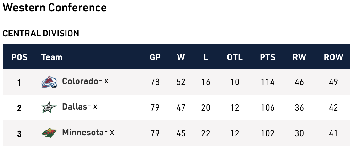 Minnesota: Thursday’s loss to Dallas will likely be the decisive game that puts the Wild third in the Central, but there’s an outside shot they could still catch the Stars. Minnesota will need a lot of help from Dallas, of course, but if the Stars lose to the Rangers and the Wild beat Nashville on Saturday, it will at least make it interesting heading into the final week. Minnesota would have to pass Dallas in points outright since the Stars have already clinched the tiebreaker between the two.