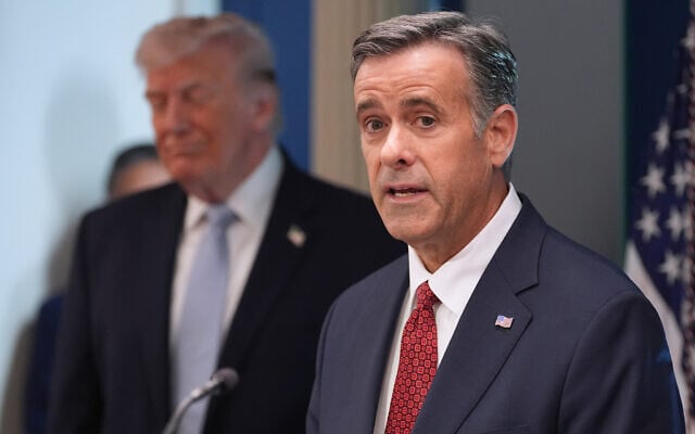 CIA Director John Ratcliffe speaks with reporters in the James Brady Press Briefing Room at the White House, April 6, 2026, in Washington, as President Donald Trump looks on. (AP Photo/Alex Brandon)