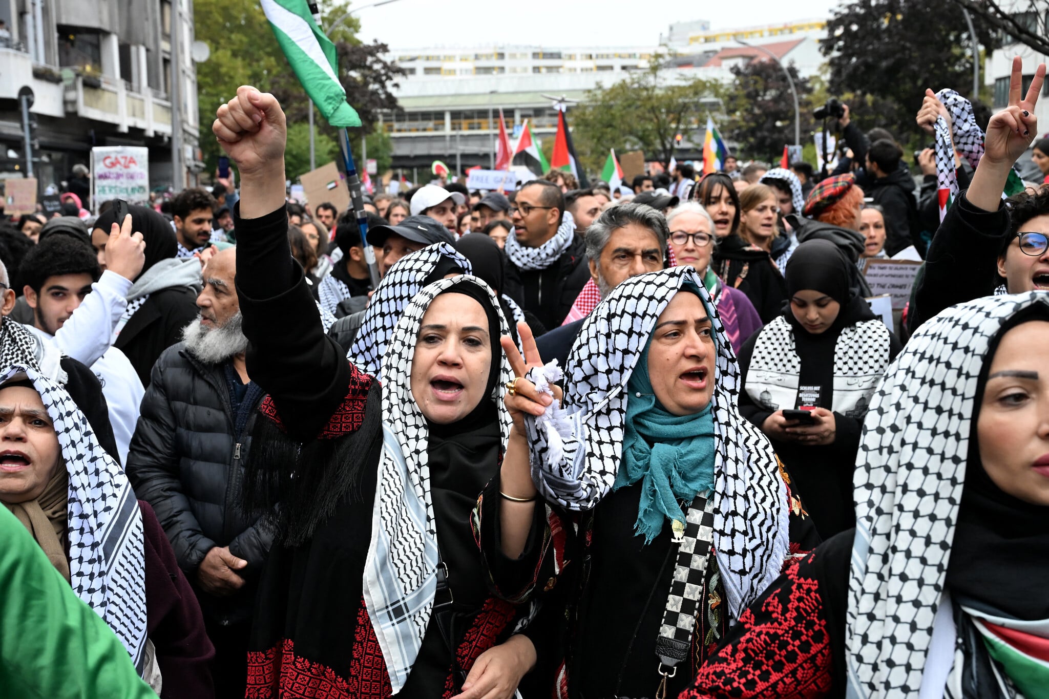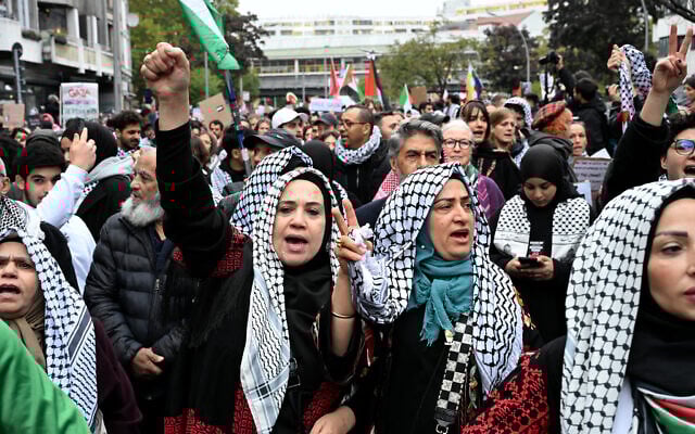 Illustrative: Pro-Palestinian, anti-Israel demonstrators near Kottbusser Tor Square in Berlin’s Kreuzberg district on October 6, 2024. (RALF HIRSCHBERGER / AFP)
