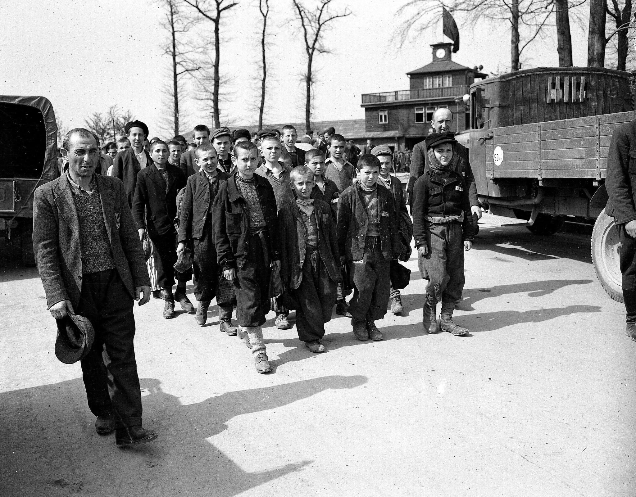 Children and other prisoners liberated from the Buchenwald concentration camp march together near Weimar, Germany, April 1945. (AP Photo/Byron H. Rollins, file)