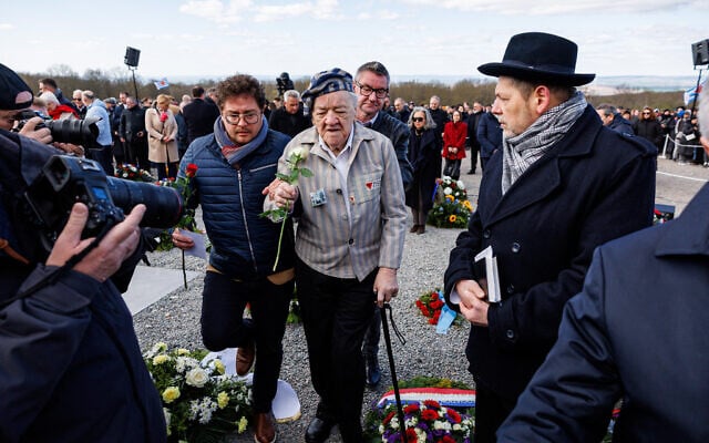 Holocaust survivor Alojzy Maciak from Poland attends the commemoration ceremony to mark the 80th anniversary of the liberation of the Buchenwald Nazi concentration camp at the camp’s memorial site in Buchenwald, near Weimar, eastern Germany, on April 6, 2025. (JENS SCHLUETER / AFP)