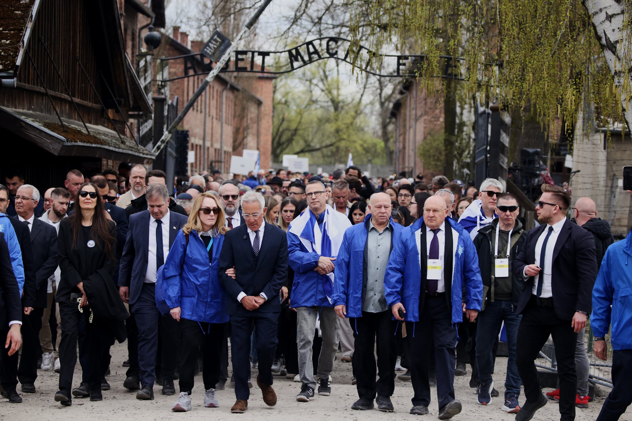 People take part in the annual ‘March of the Living’ to commemorate the Holocaust, a yearly Holocaust remembrance march between the former death camps of Auschwitz and Birkenau, in Oswiecim, Poland, April 14, 2026. (AP Photo/Beata Zawrzel)