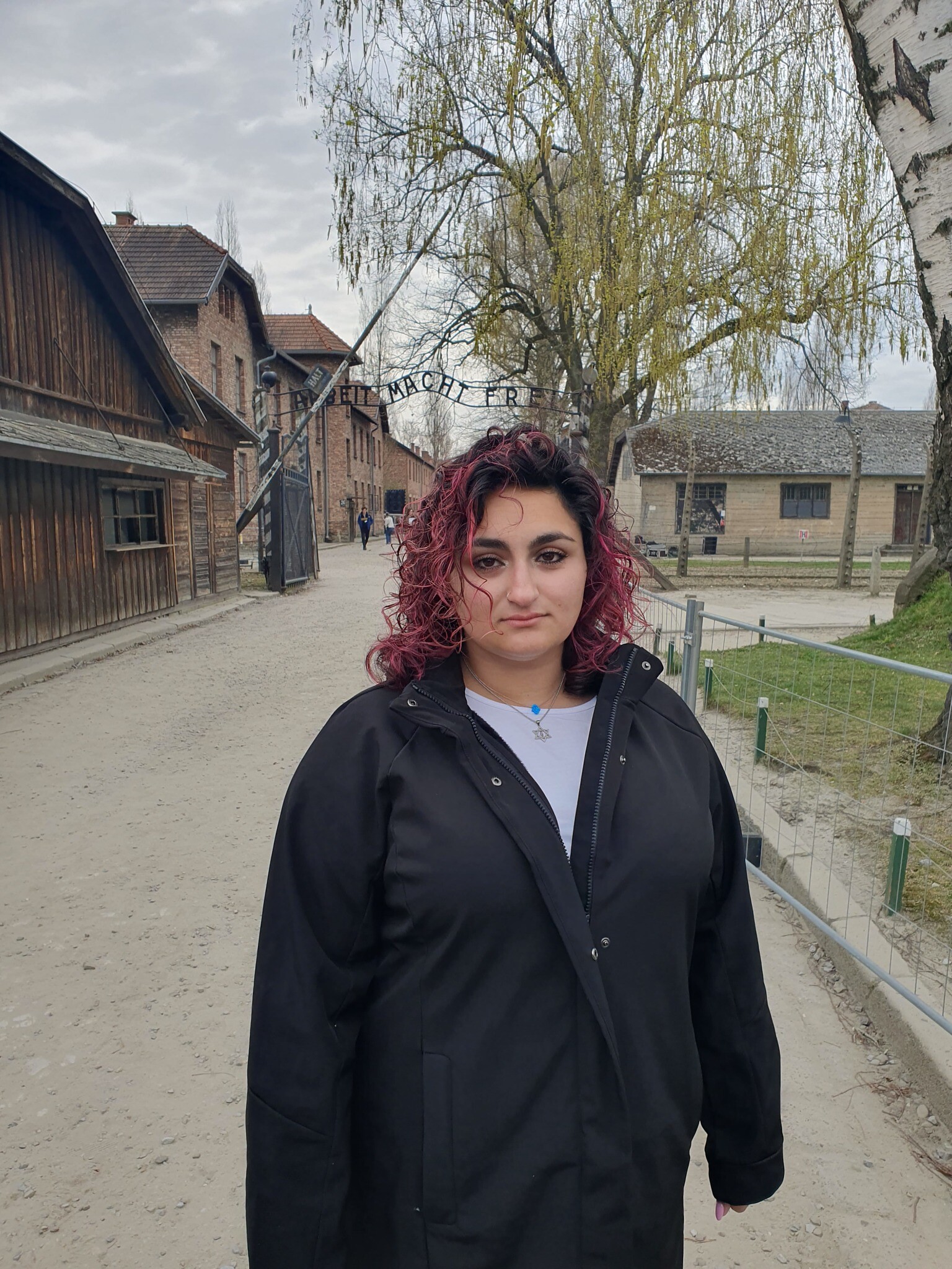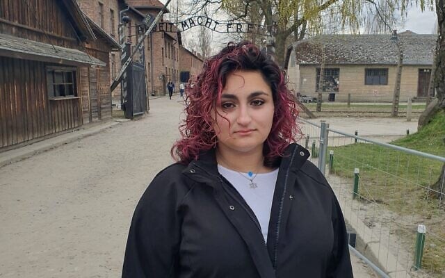 Abbie Talmoud, a survivor of the terror attack at the Capital Jewish Museum in Washington, DC, stands at the gate to Auschwitz on April 13, 2026. (Yossi Zeliger)