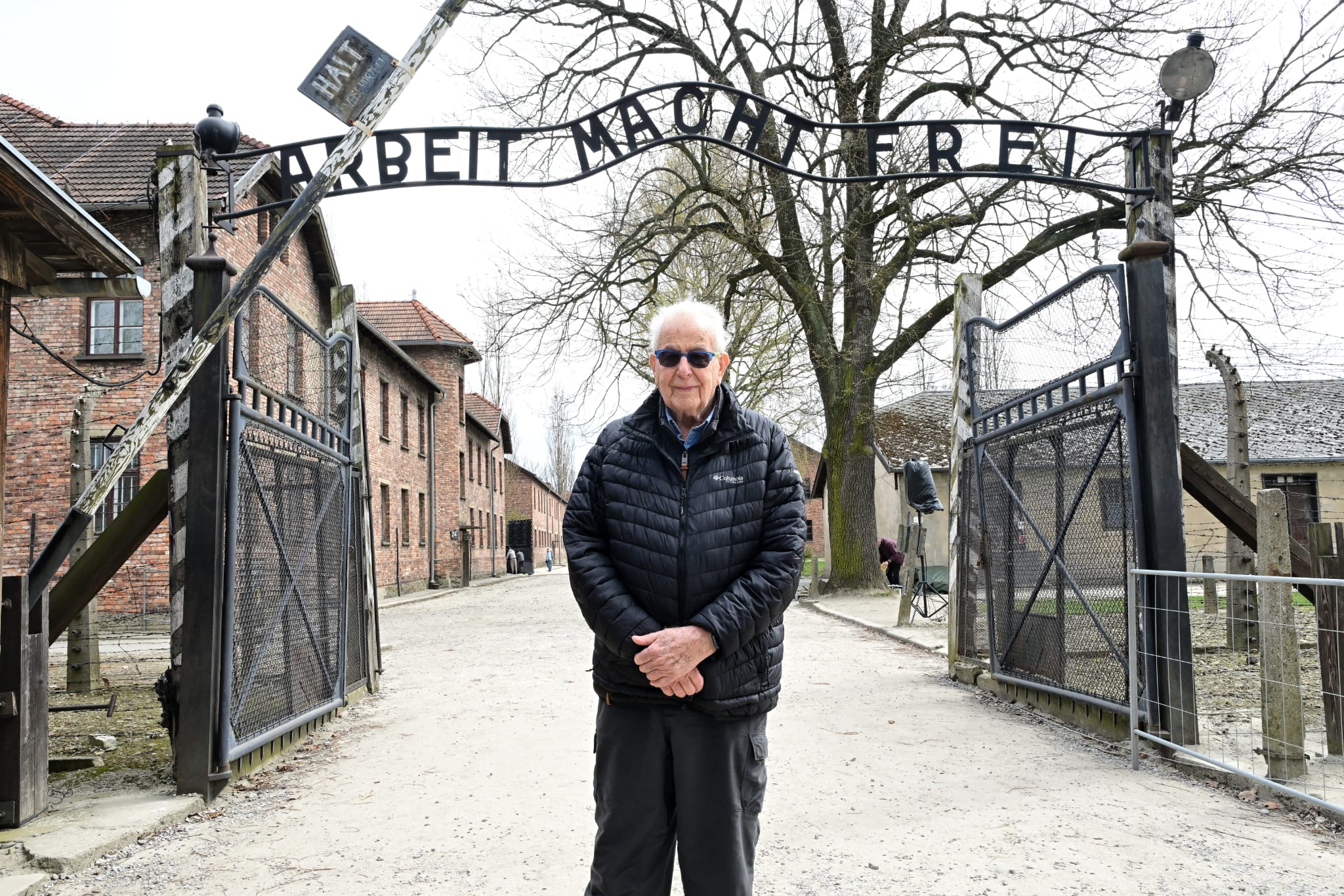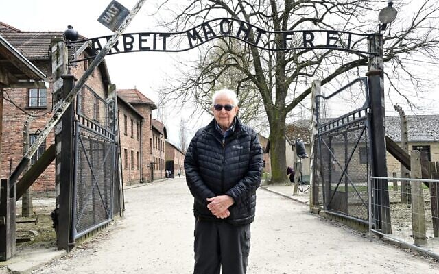 Holocaust survivor Naftali Furst returns to Auschwitz, where he arrived with his family in 1944, on April 13, 2026. (Yossi Zeliger)