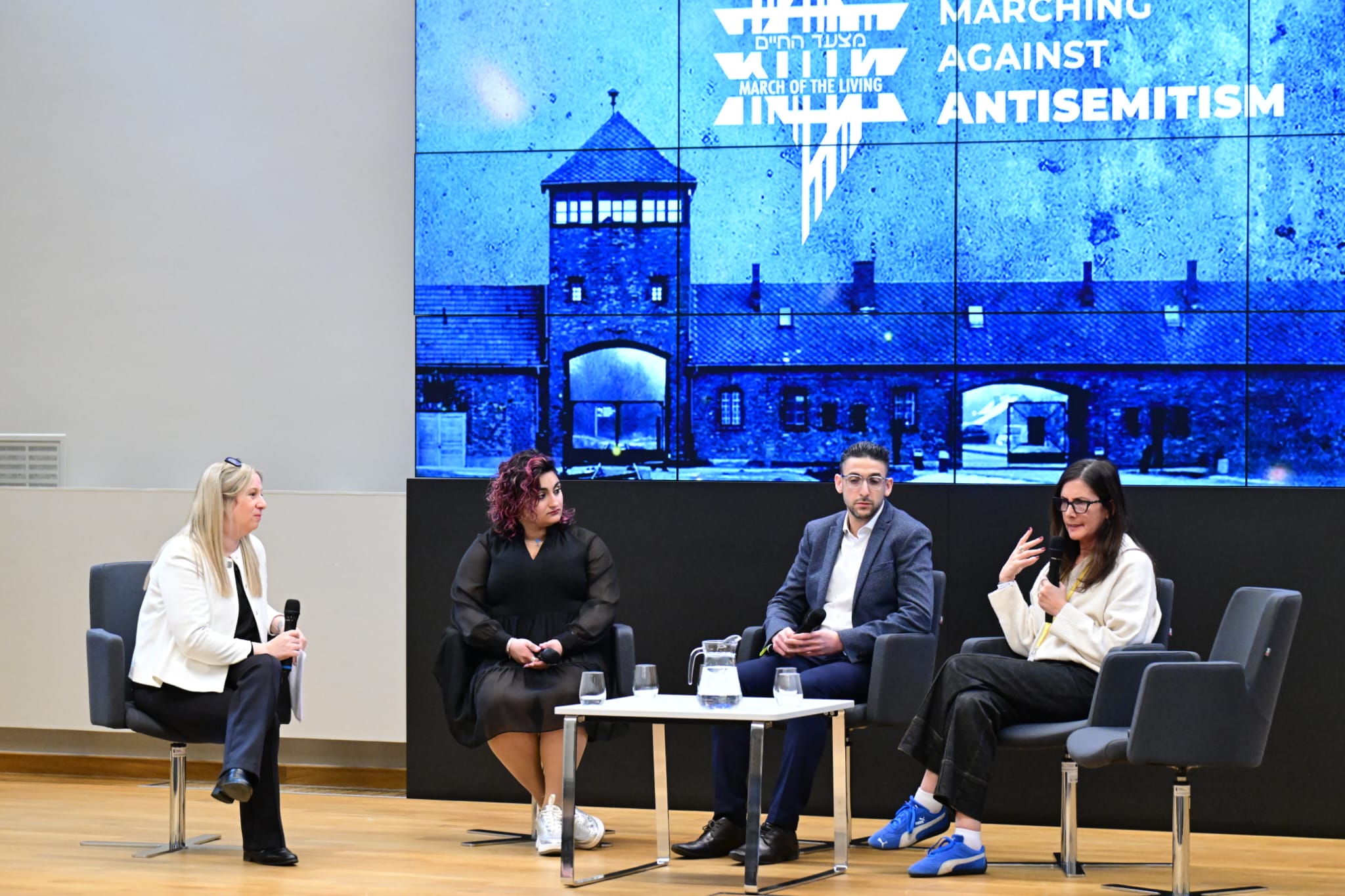 Revital Yakin Krakovsky, deputy CEO of International March of the Living and CEO of March of the Living Israel (far left), interviewed survivors of three antisemitic terrorist attacks in 2025. Next to her is Abbie Talmoud, who survived the Jewish museum attack in Washington. Center, right: Yoni Finlay who was injured in the Yom Kippur attack on a synagogue in Manchester and (far right) Hanna Abesidon, who survived the shooting at Bondi Beach in which her father was murdered. (courtesy)