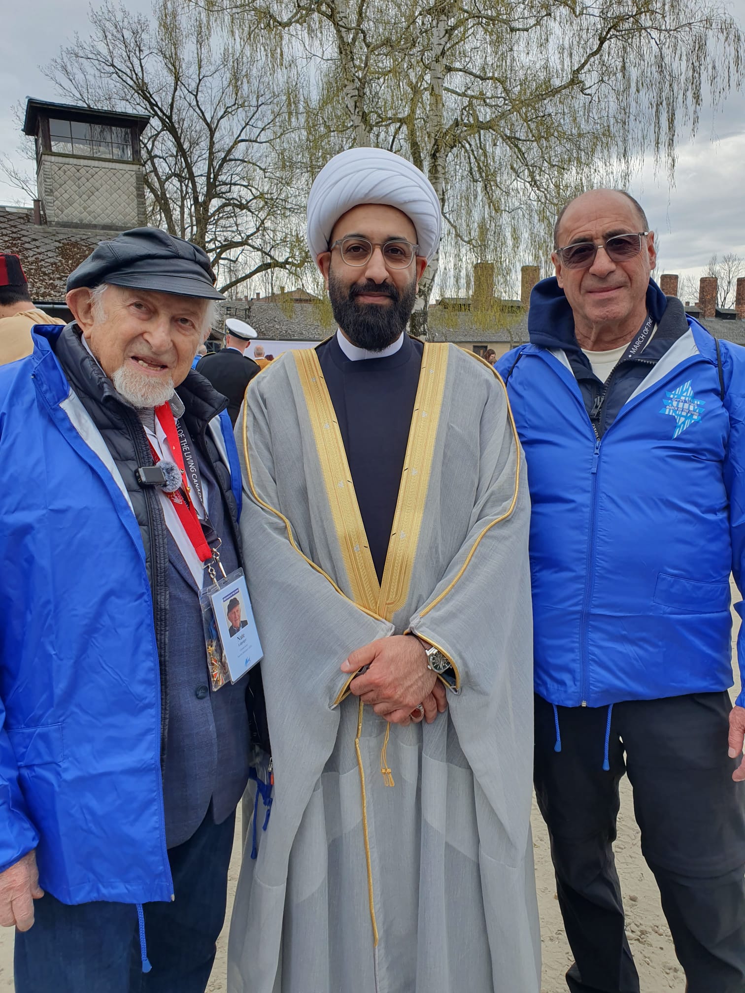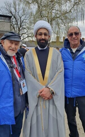 L-R: Ninety-eight-year-old Auschwitz survivor Nate Leipciger, Imam Mohammad Tawhidi from UAE and Canada and Leipciger’s son-in-law Cary Green at the March of the Living in Poland, April 14, 2026. (courtesy)