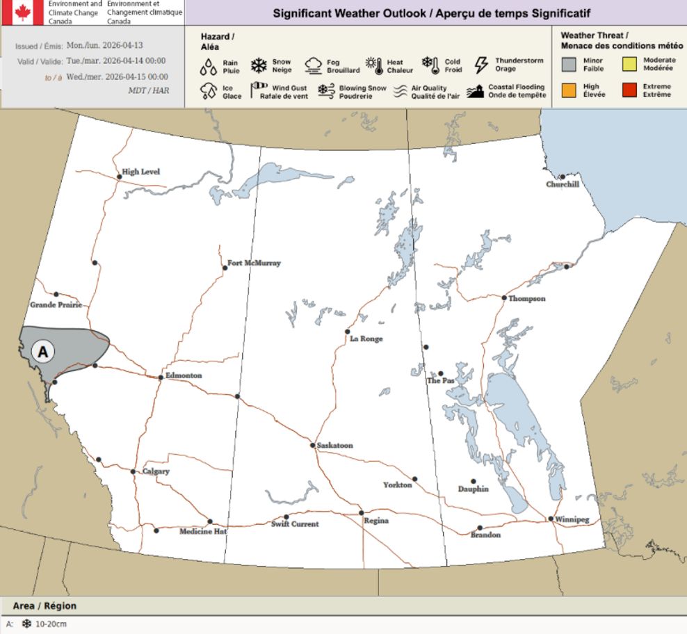 Looking at the Environment and Climate Change Canada (ECCC) Significant Weather Outlook, small portions of Alberta are at risk of seeing snow on Tuesday, April 14.