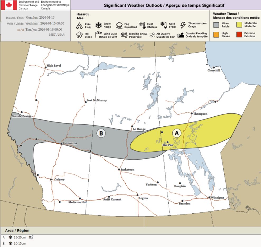 The outlook shows that the strongest round of snowfall will be on Wednesday, April 15, with a large section of the Rockies, Hinton, Whitecourt, Edmonton, and Lloydminster at risk of seeing 10 to 15 centimetres of snow.