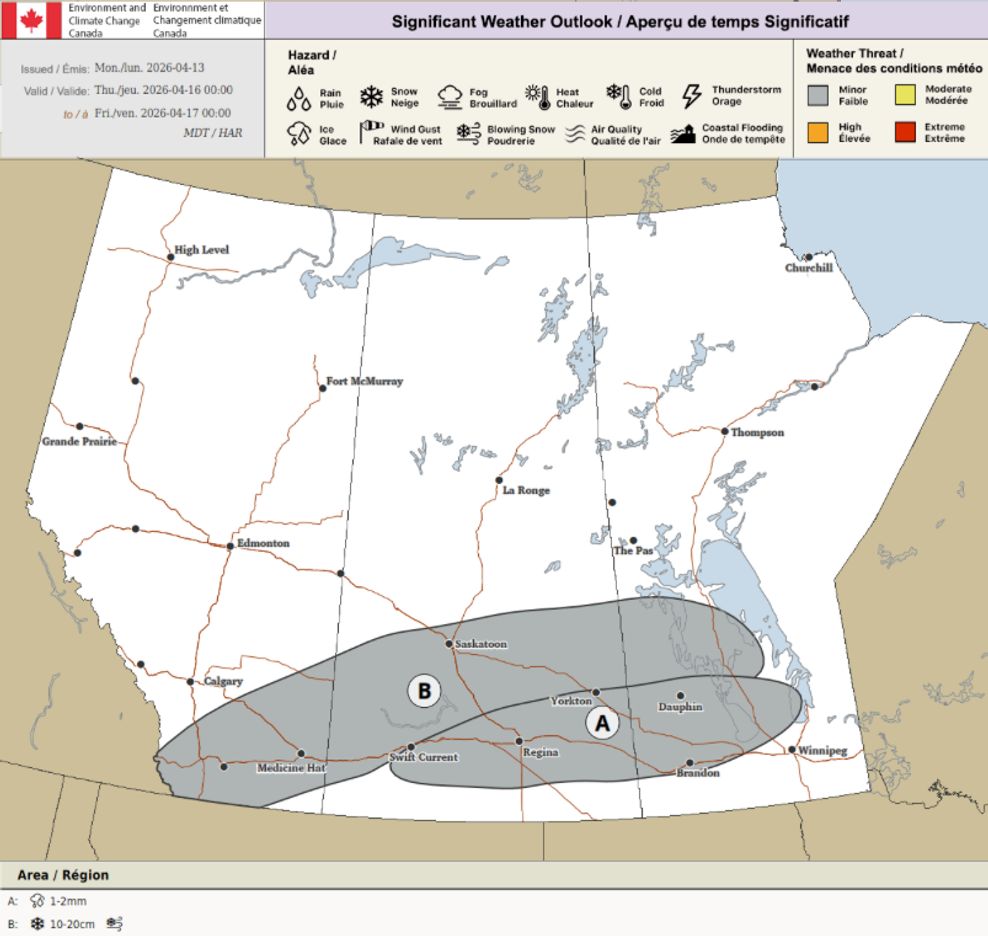 On Thursday, April 16, it’s southern Alberta’s turn to be under the risk of seeing snow, with an area stretching from Waterton Lakes National Park to the Saskatchewan border, including Medicine Hat and Lethbridge, under the gun to potentially see 10 to 20 centimetres.