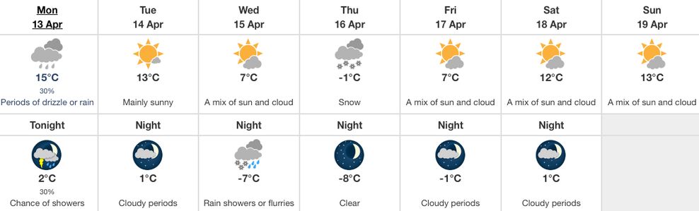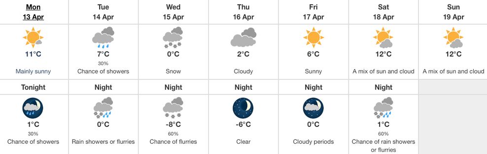 The seven-day forecast for Calgary is less snow-filled than YEG’s, with just the night of Wednesday, April 15, showing the risk of flurries or snow.