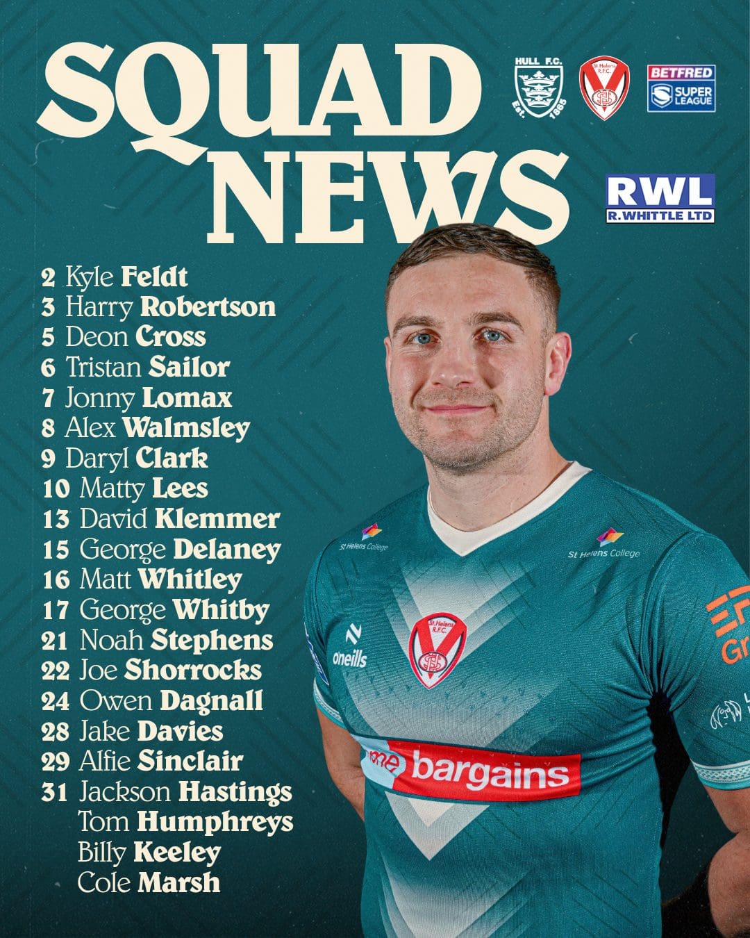 Young Saints Alfie Sinclair and Billy Keeley are included in the team travelling to Hull. If Keeley or fellow Academy graduate Tom Humphreys were to feature in the match day seventeen, they would make their official senior St.Helens and Super League debuts.