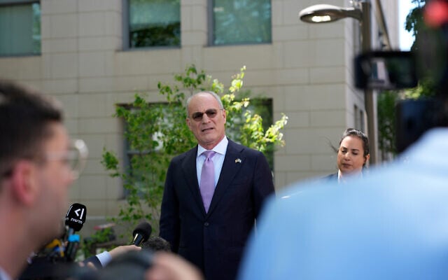Israeli Ambassador to the US Yechiel Leiter speaks to reporters outside of the State Department in Washington, April 14, 2026. (AP/Pablo Martinez Monsivais)