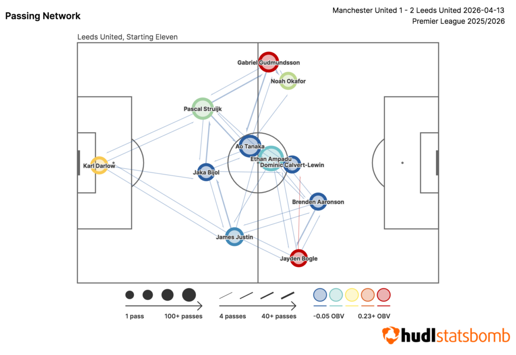 Above: Leeds United’s passing network v Manchester United in Gameweek 32