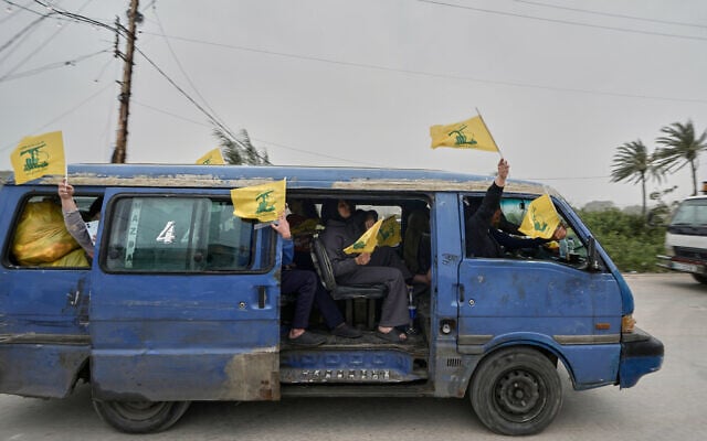 Displaced people sit in a van and wave Hezbollah flags, as they return to their villages in Qasmiyeh, southern Lebanon, April 18, 2026. (AP Photo/Bilal Hussein)