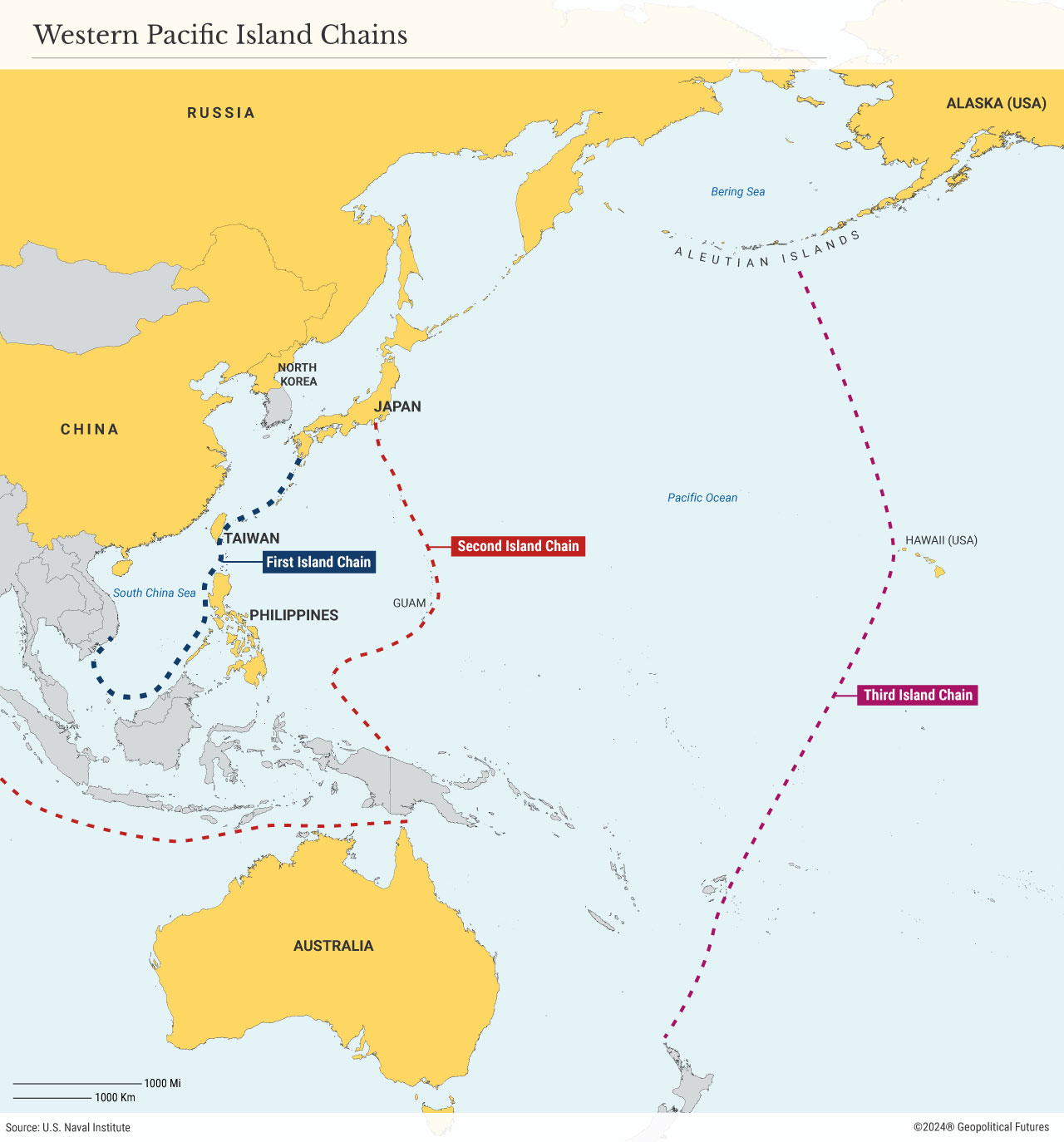 The geographic foundation of U.S. strategy in the region is what’s called the first island chain, a group of Pacific islands that includes Japan, Taiwan, the Philippines and Papua New Guinea and extends all the way to Australia. The first island chain establishes reliable but wide sea lanes through which ships from China’s east coast pass to reach the Pacific Ocean and, by extension, the foreign markets on which its export-oriented economy depends. These shipping lanes would also be crucial in times of war, especially with the U.S., because they can be easily blockaded or otherwise targeted, given the predictability of Chinese passage.