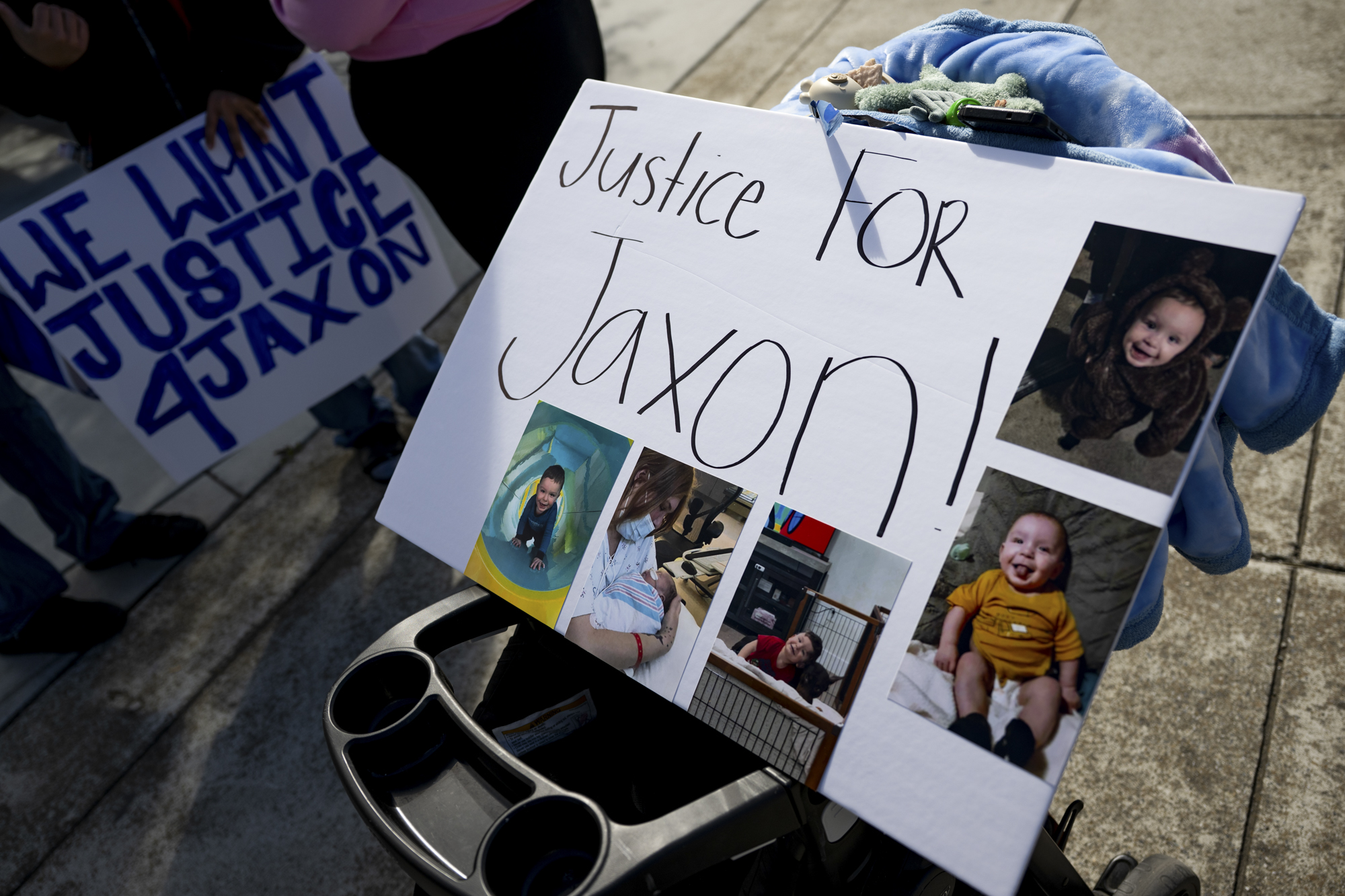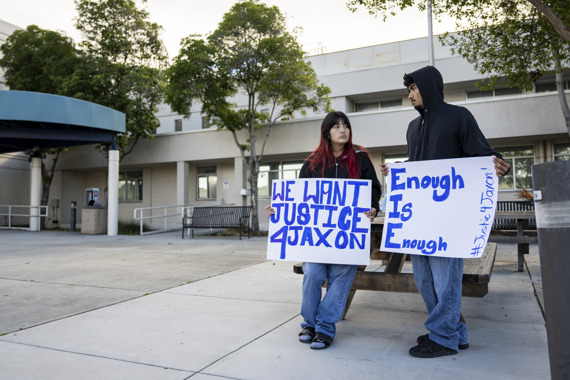 A sign says, “Justice for Jaxon” outside the Santa Clara County Juvenile Court in San José on April 20, 2026. (Beth LaBerge/KQED)