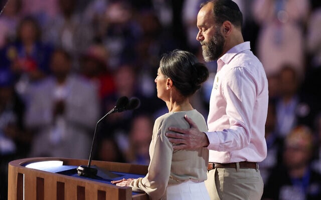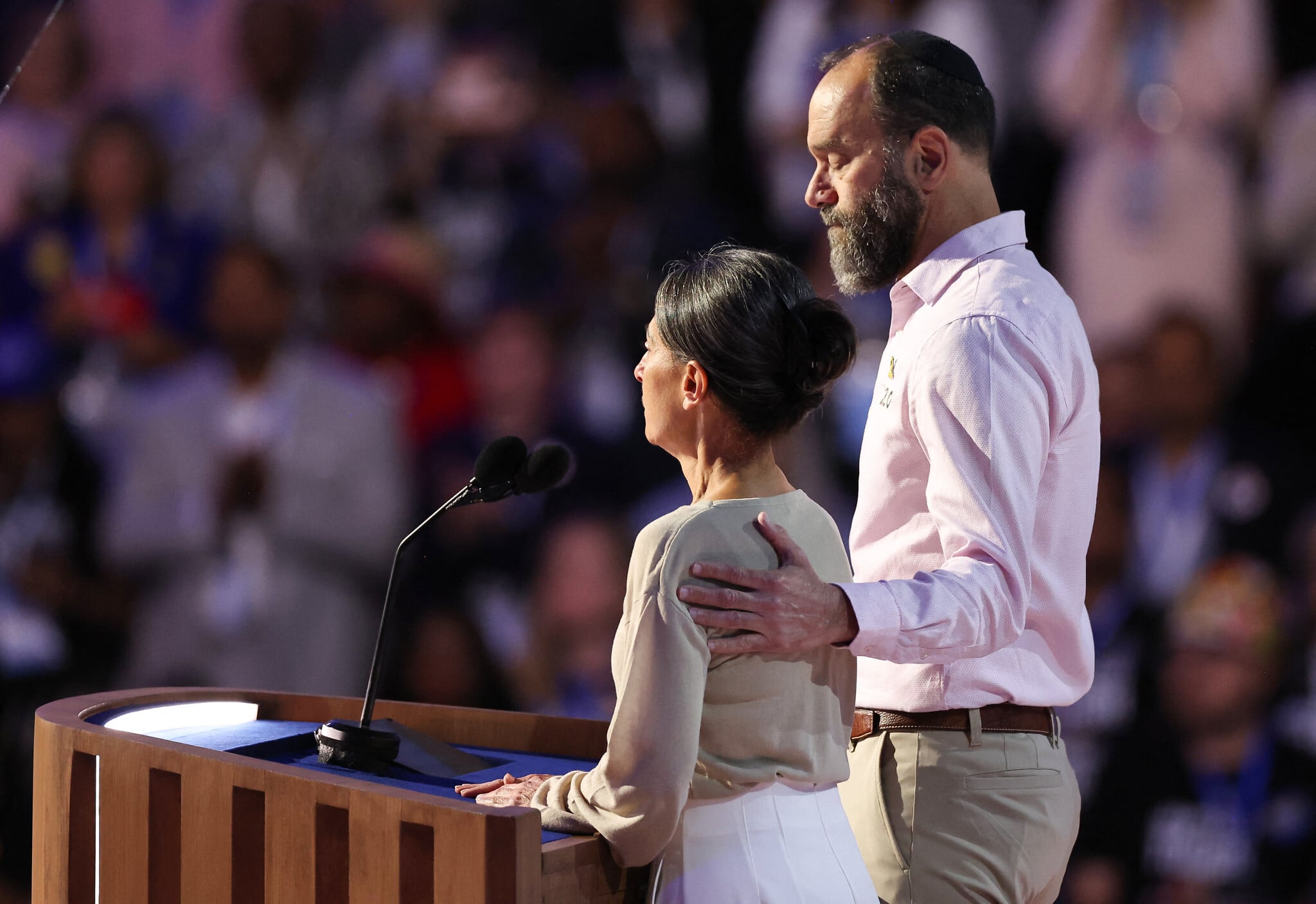 Parents of hostage Hersh Goldberg-Polin, Rachel Goldberg-Polin and Jon Polin speak on the third day of the Democratic National Convention at the United Center in Chicago, Illinois, on August 21, 2024. (CHARLY TRIBALLEAU / AFP)