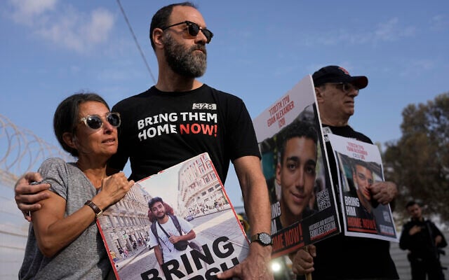 Rachel Goldberg-Polin, left, and Jon Polin, center, parents of Israeli-American hostage Hersh Goldberg-Polin, along with other relatives of hostages held in the Gaza Strip by Hamas, take part in a protest calling for their release in Kibbutz Nirim, August 29, 2024. (AP Photo/Tsafrir Abayov, File)