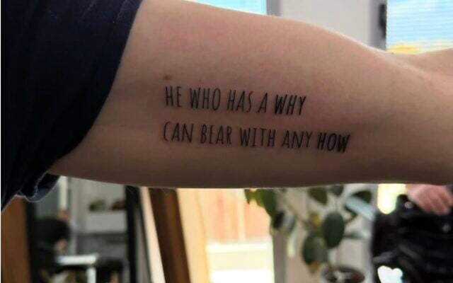 Freed hostage Or Levy’s arm in an image posted by him on March 19, 2025, with a fresh tattoo of a quote cited by fellow hostage Hersh Goldberg-Polin, who was later murdered in captivity. (Courtesy)