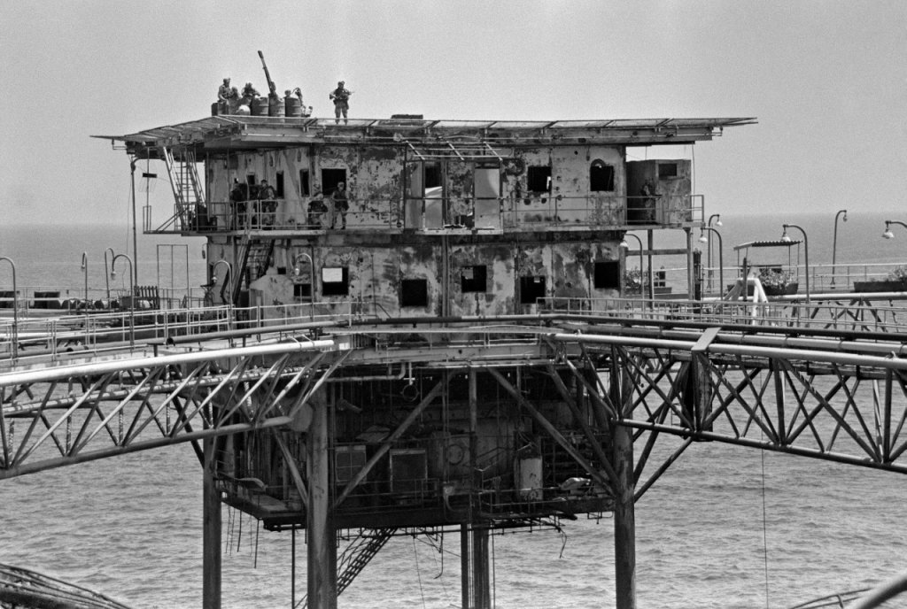 A view of an Iranian oil platform after being strafed by US forces. Marines raided the platform to gather intelligence data and military equipment used by Iranians. The platform was later destroyed by gunfire from US destroyers in retaliation for the Iranian mining of the guided missile frigate USS Samuel B. Roberts in the Persian Gulf (USN)