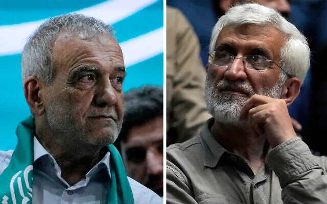Combination of photos showing Masoud Pezeshkian, left, and Saeed Jalili. (AP/Vahid Salemi)